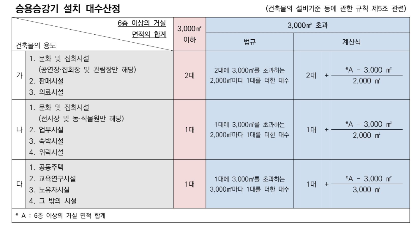 1. 위 표에 따라 승강기의 대수를 계산할 때 8인승 이상 15인승 이하의 승강기는 1대의 승강기로 보고, 16인승 이상의 승강기는 2대의 승강기로 본다.